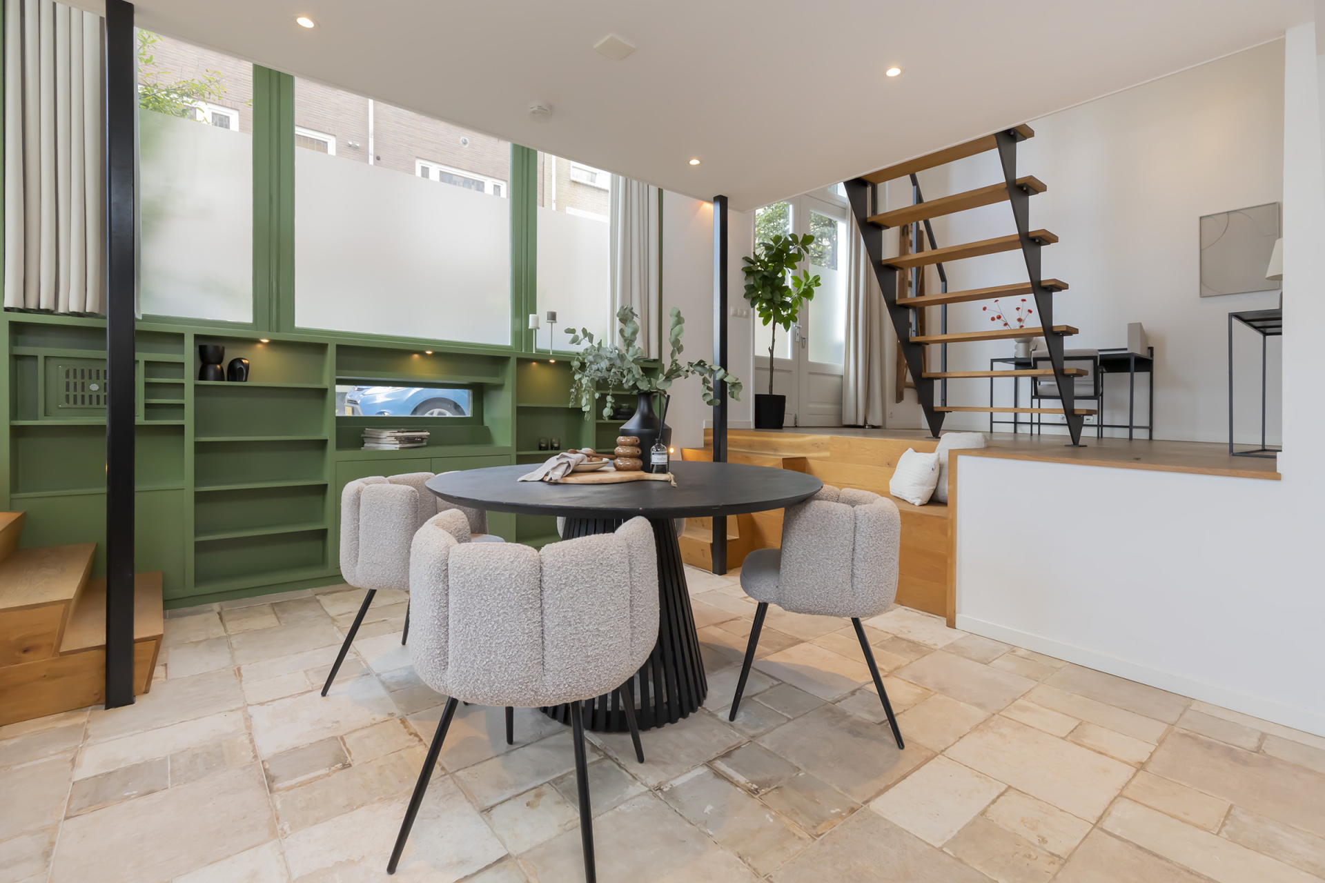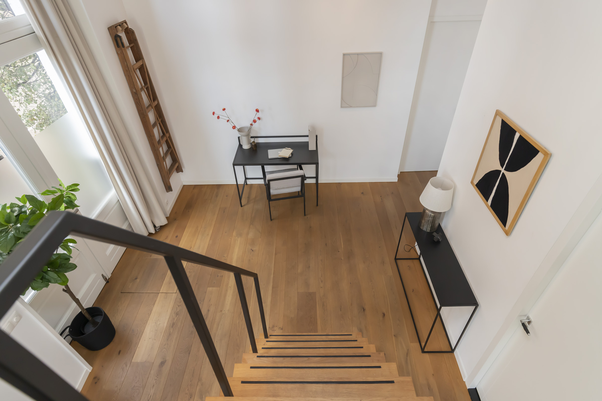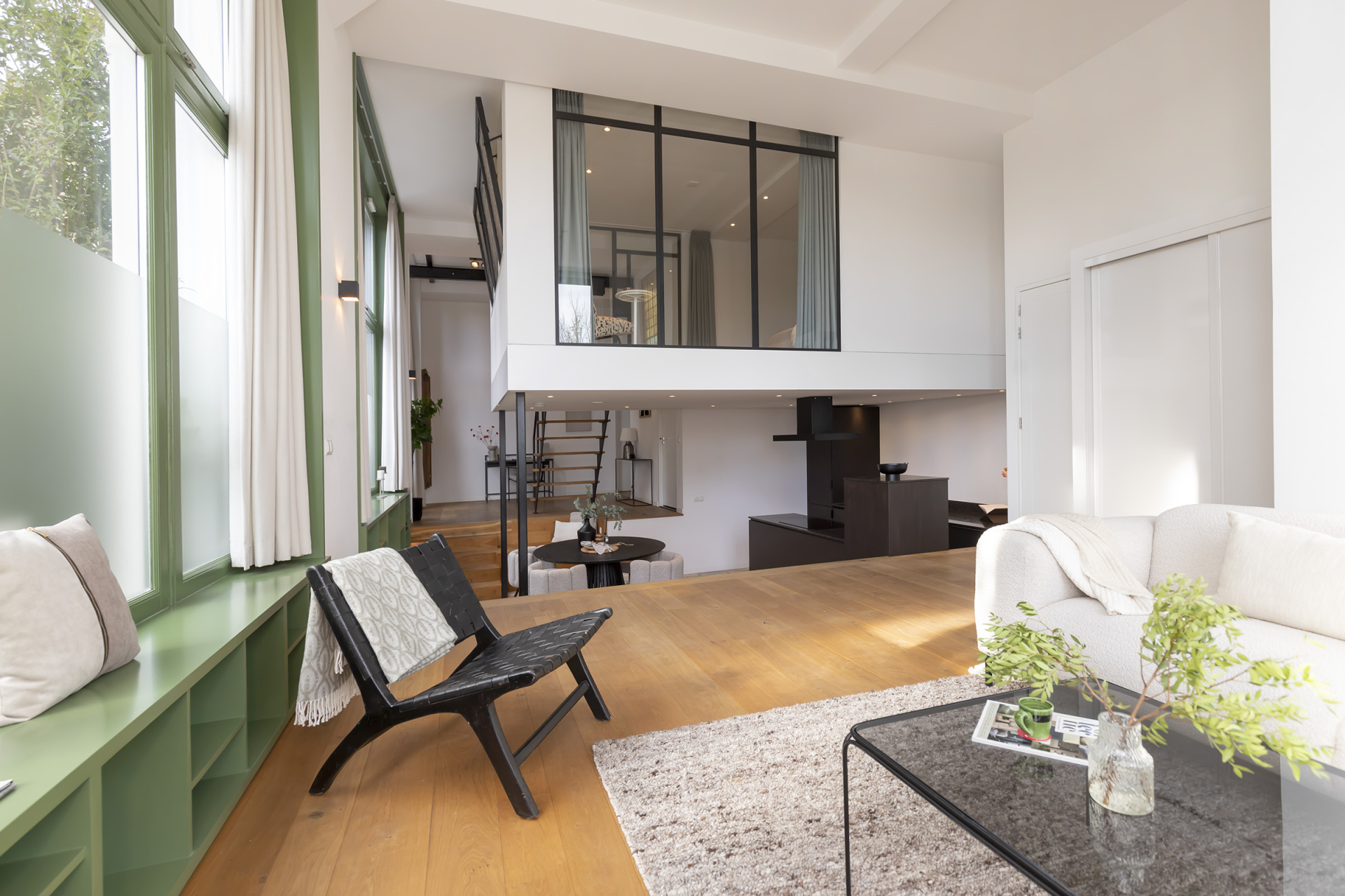 Een woning die zich onderscheidt door zijn speelse indeling, hoge plafonds en industriële details, gecombineerd met een warme en stijlvolle afwerking.