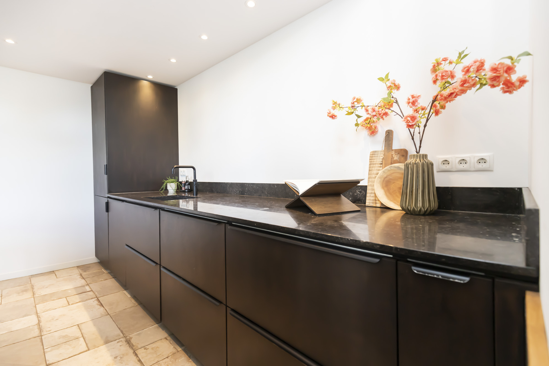 Via je eigen voordeur kom je in de hal met garderobe. De woonkeuken vormt het hart van de woning: strak, modern, voorzien van inbouwapparatuur en met een warm hardstenen werkblad. Grote raampartijen zorgen voor licht en sfeer. Enkele treden brengen je naar de woonkamer aan de voorzijde – hoog, ruim en prettig ingedeeld.