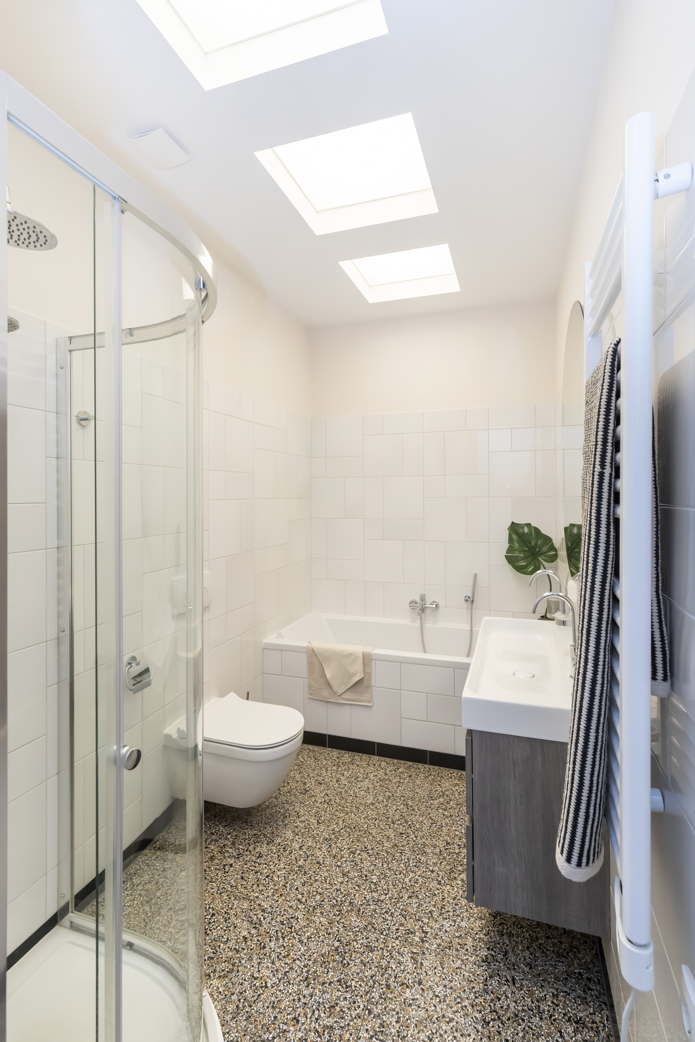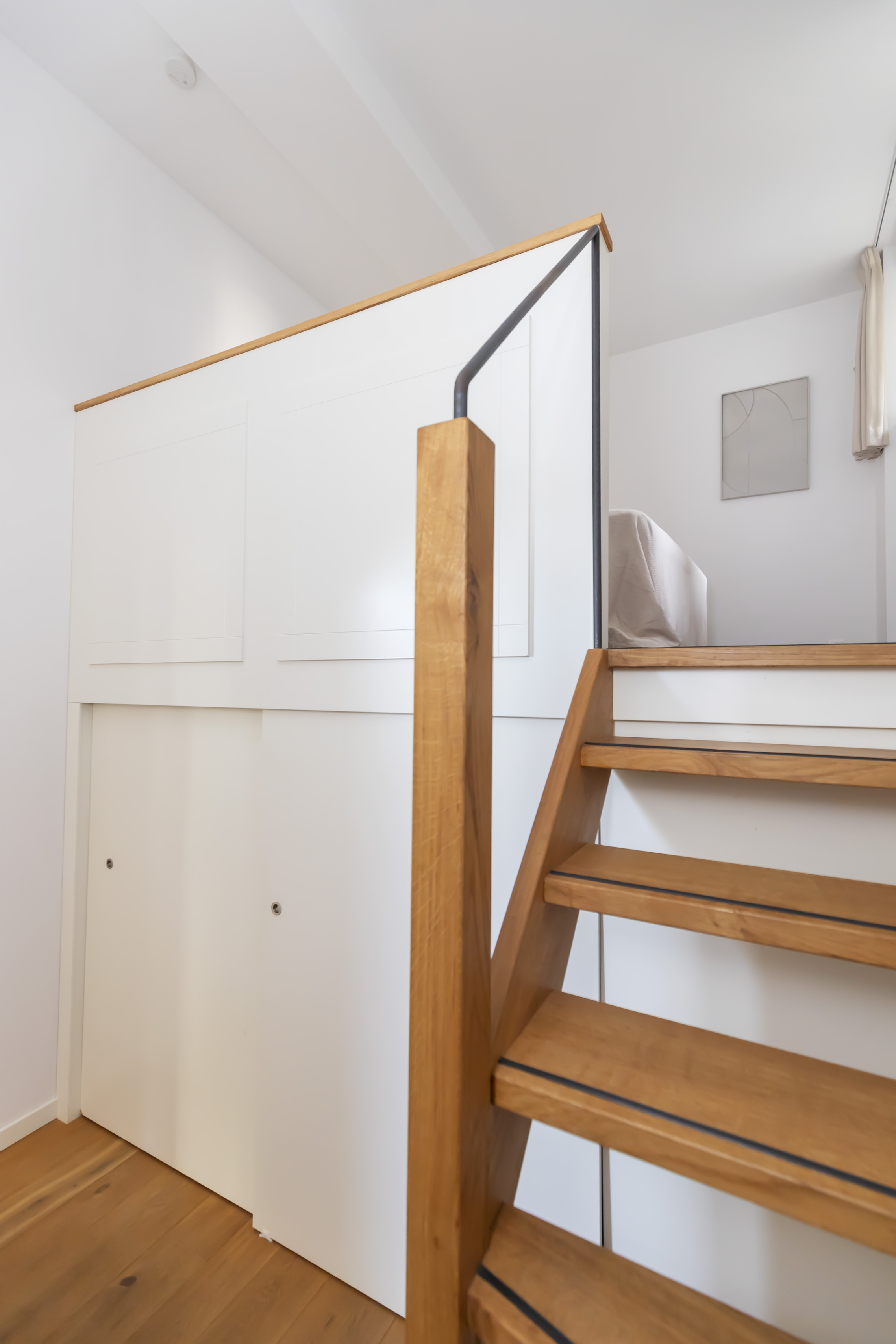 De twee slaapkamers liggen elk op een entresol. De studeerhoek heeft openslaande deuren naar de straat, een heerlijke plek om te ontspannen. De badkamer is modern en compleet, met ligbad, dubbele wastafel en tweede toilet. Daarnaast is er een aparte wasruimte en een separaat gastentoilet.