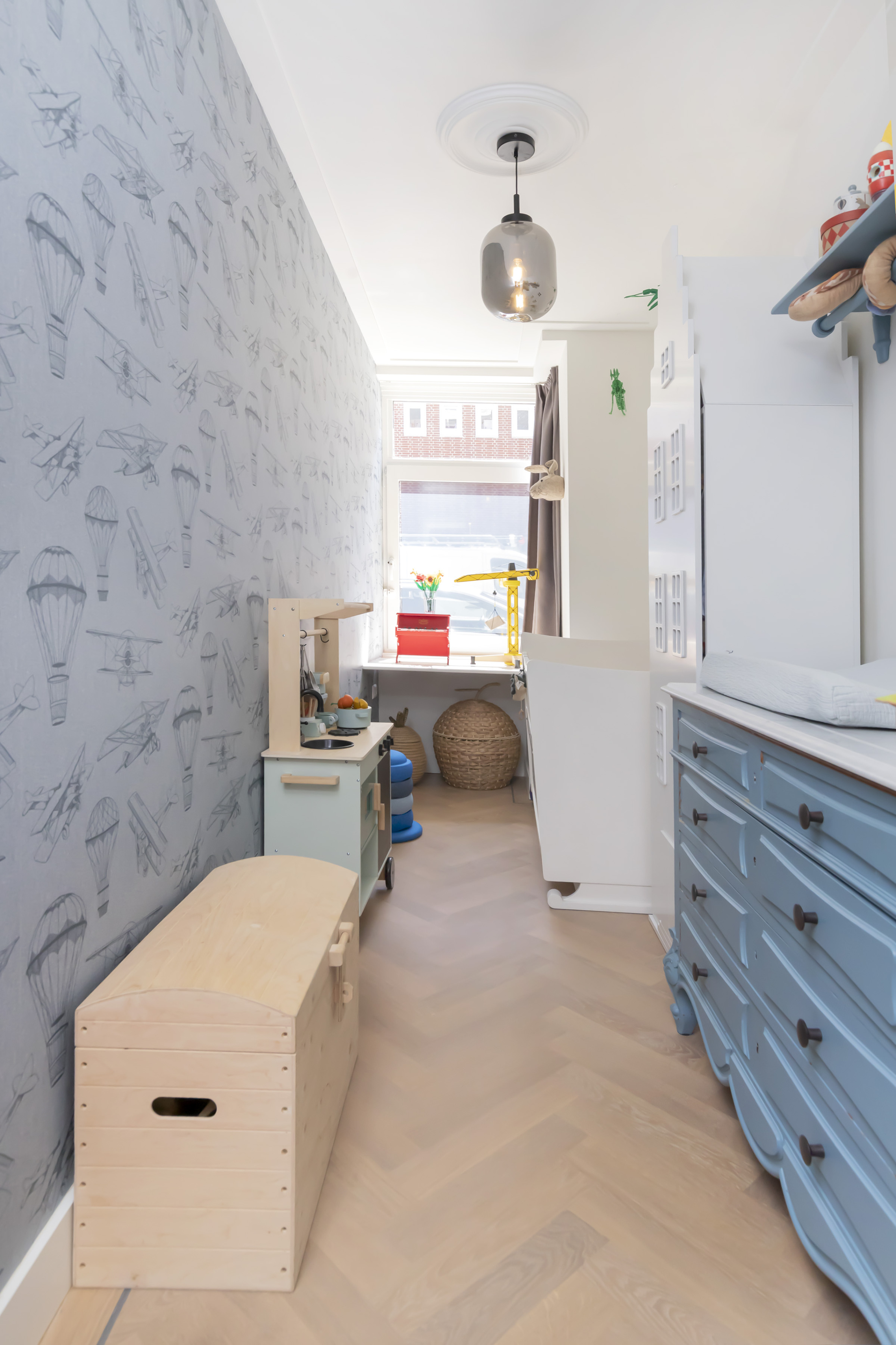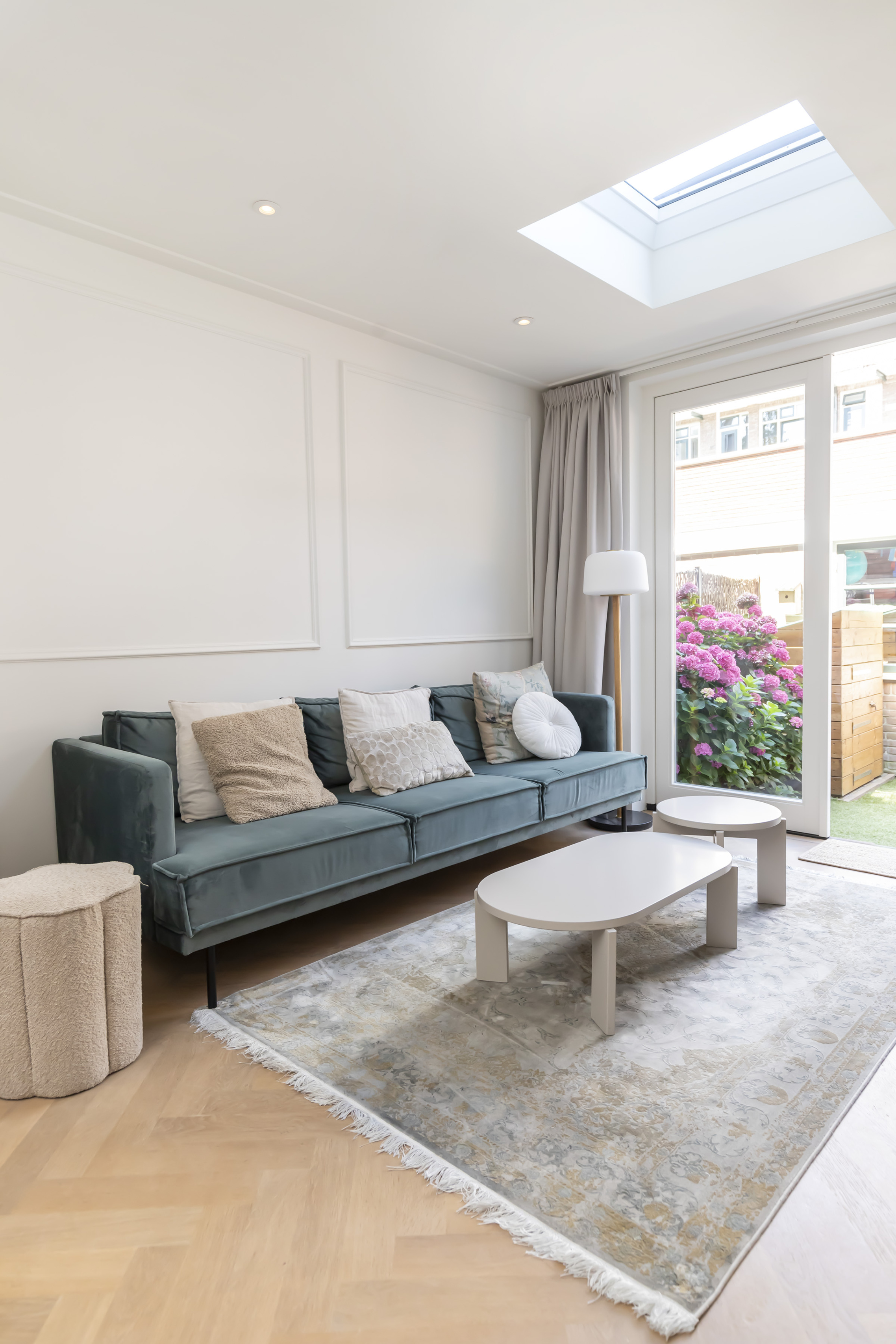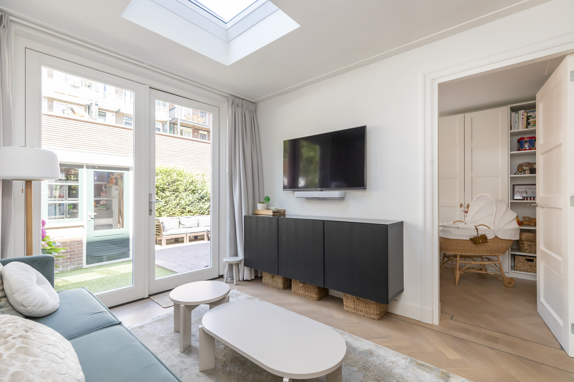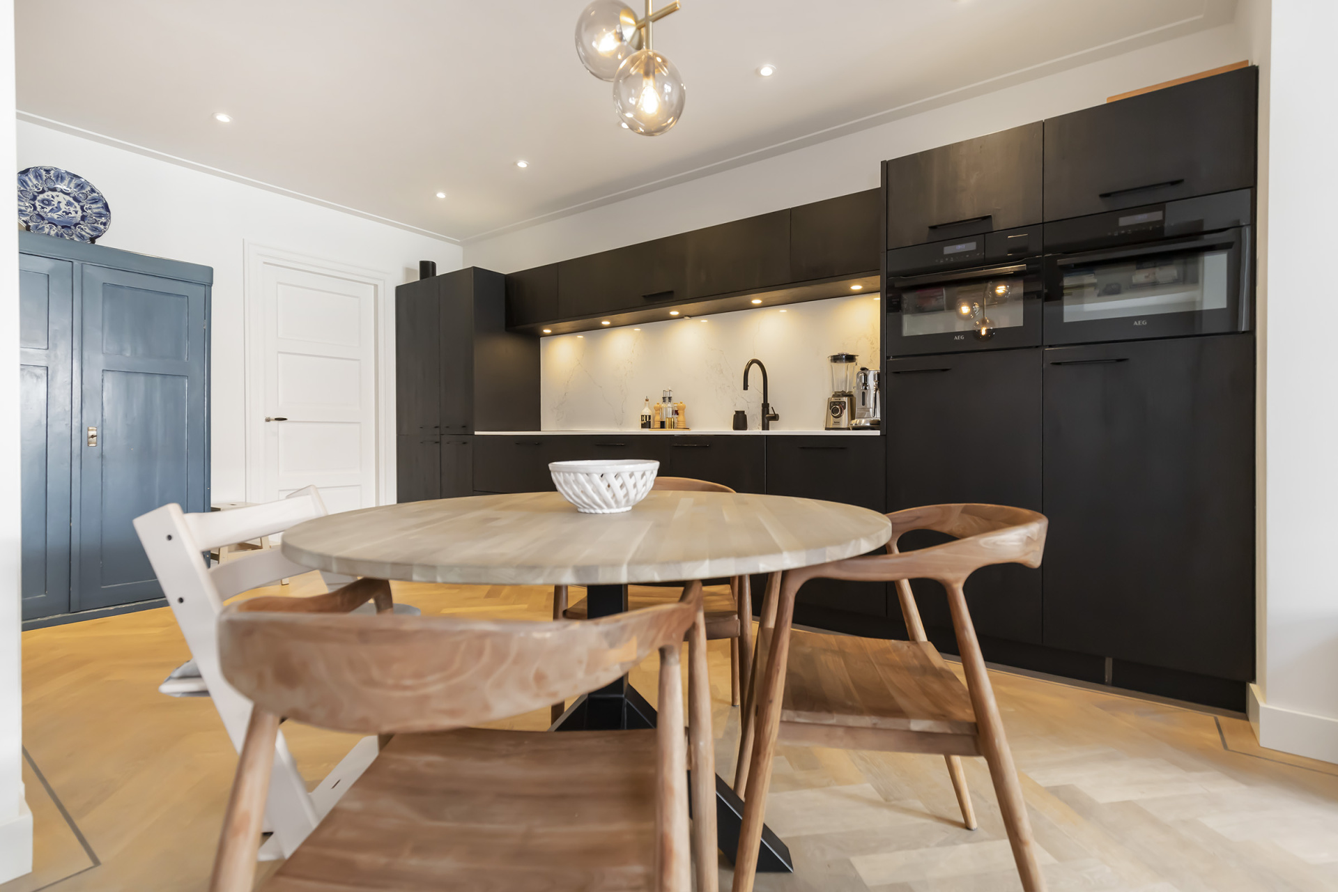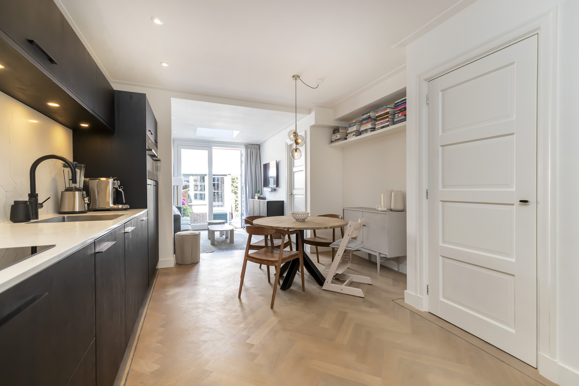 De lichte woonkamer is voorzien van een stijlvolle visgraat parketvloer, een daklicht met driedubbel glas en openslaande deuren naar de tuin. De moderne keuken is een echte eyecatcher en uitgerust met hoogwaardige inbouwapparatuur: een 4-pits inductiekookplaat, Quooker, twee ovens (een stoomoven en een combimagnetron), een grote koelkast en een separate vriezer.