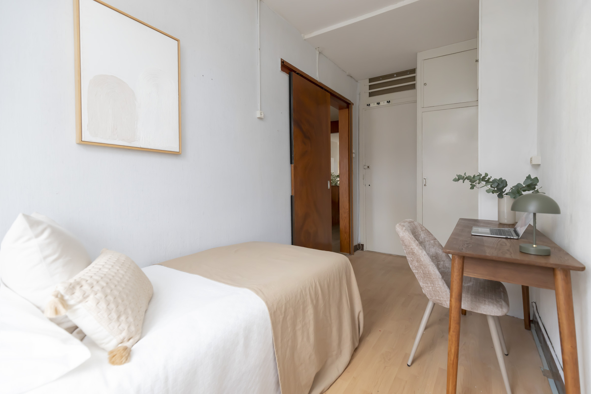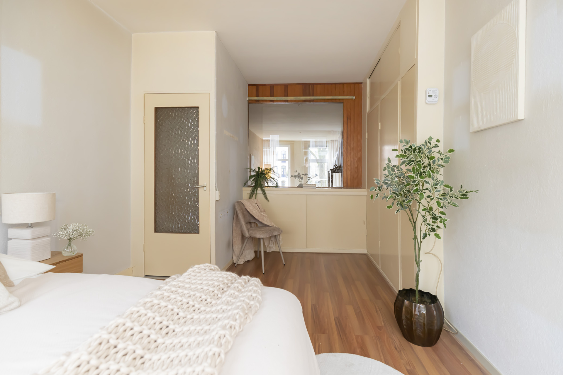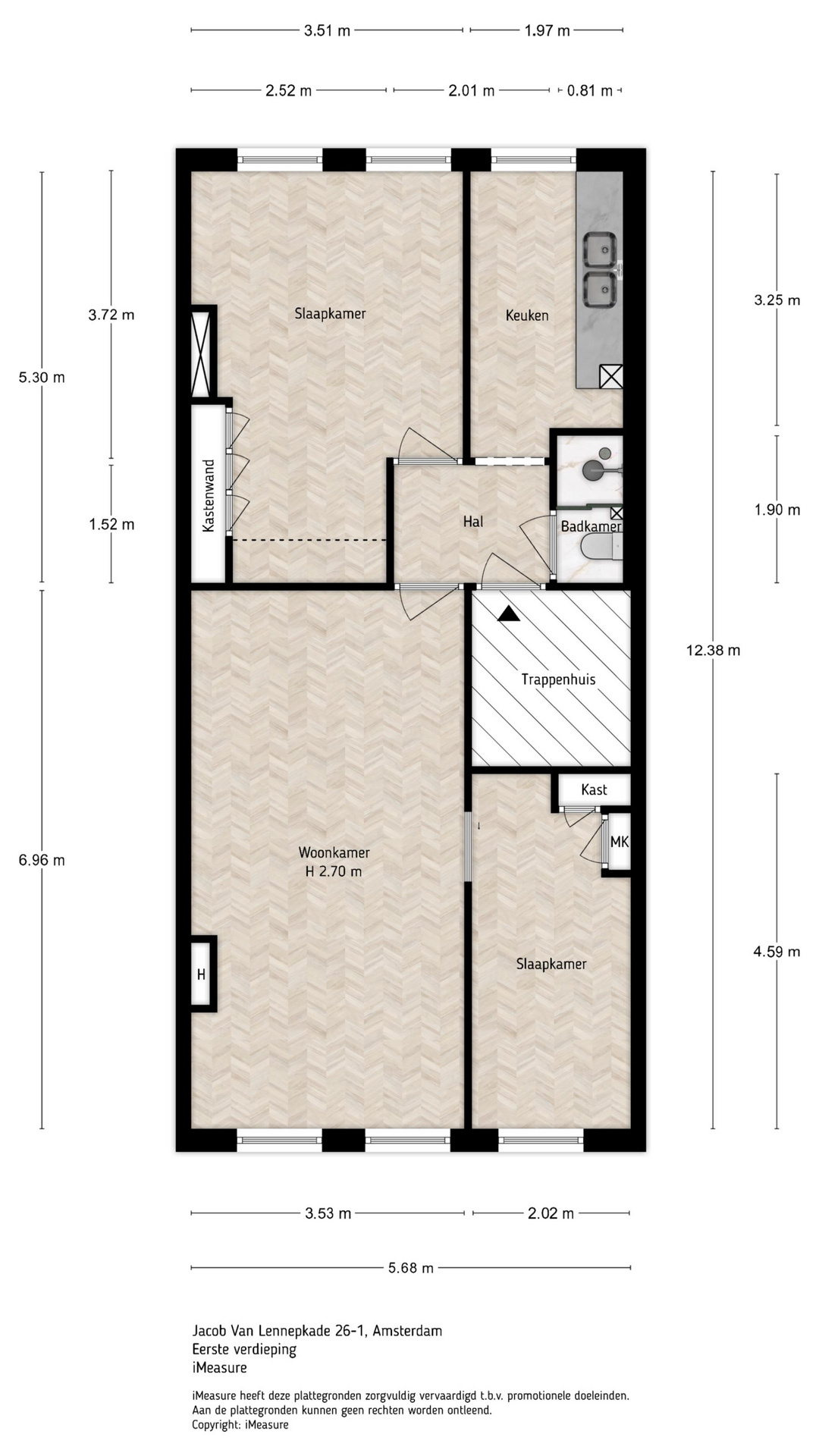 Via de entree op de eerste etage kom je in de hal waar vanuit de badkamer met toilet, de aan de achterzijde gelegen grote slaapkamer, de keuken en de zitkamer met het uitzicht op het Jacob van Lennepkanaal te bereiken zijn. De slaap / werkkamer aan de voorzijde is te bereiken vanuit de zitkamer.