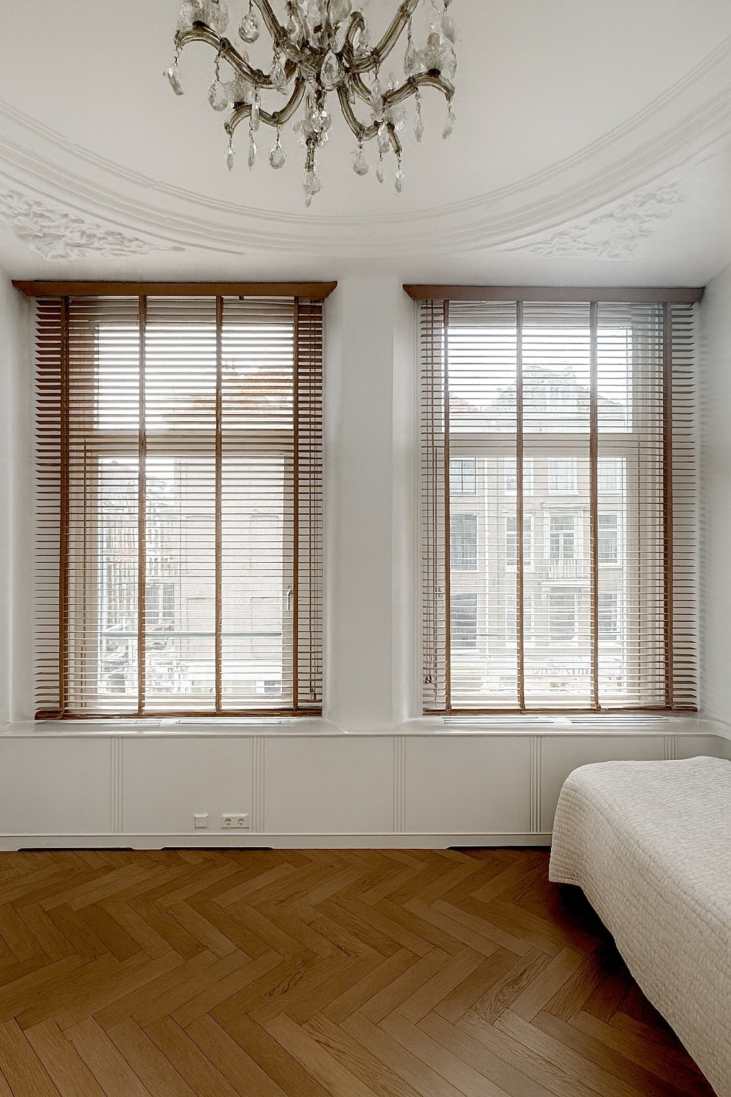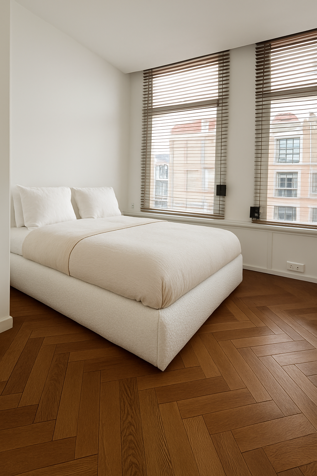 Master-bedroom met rolluiken en op maat gemaakte kledingkast, direct verbonden met de badkamer.