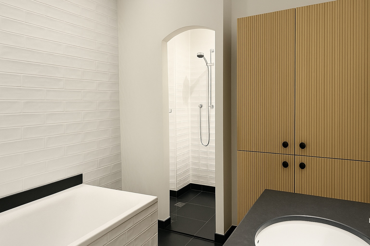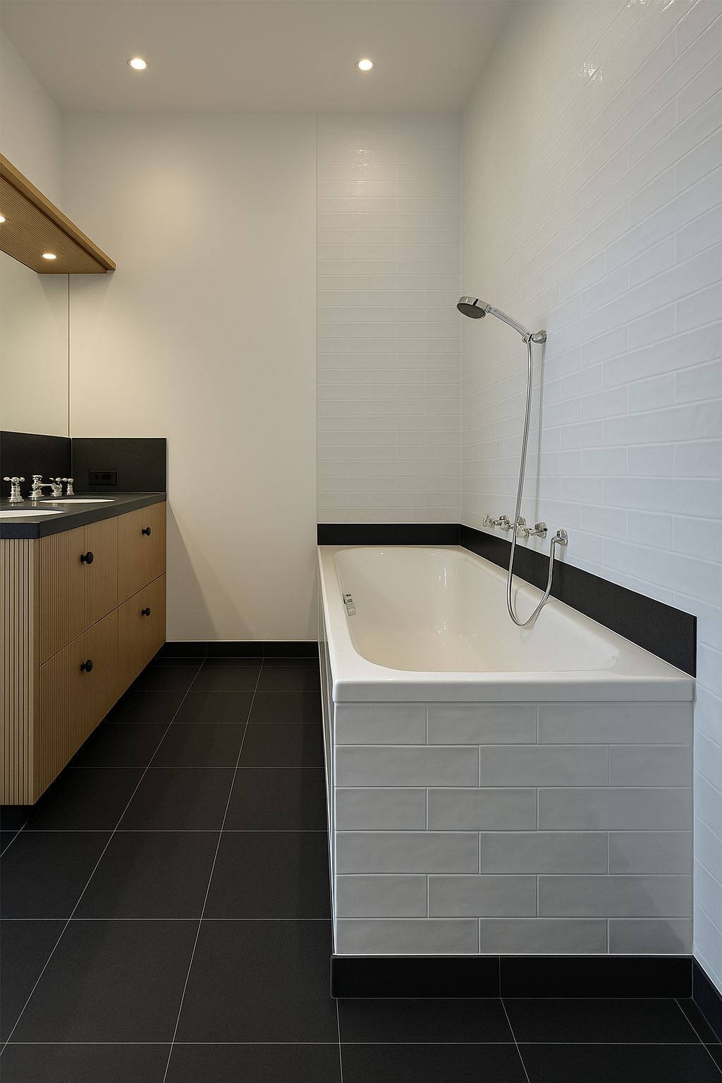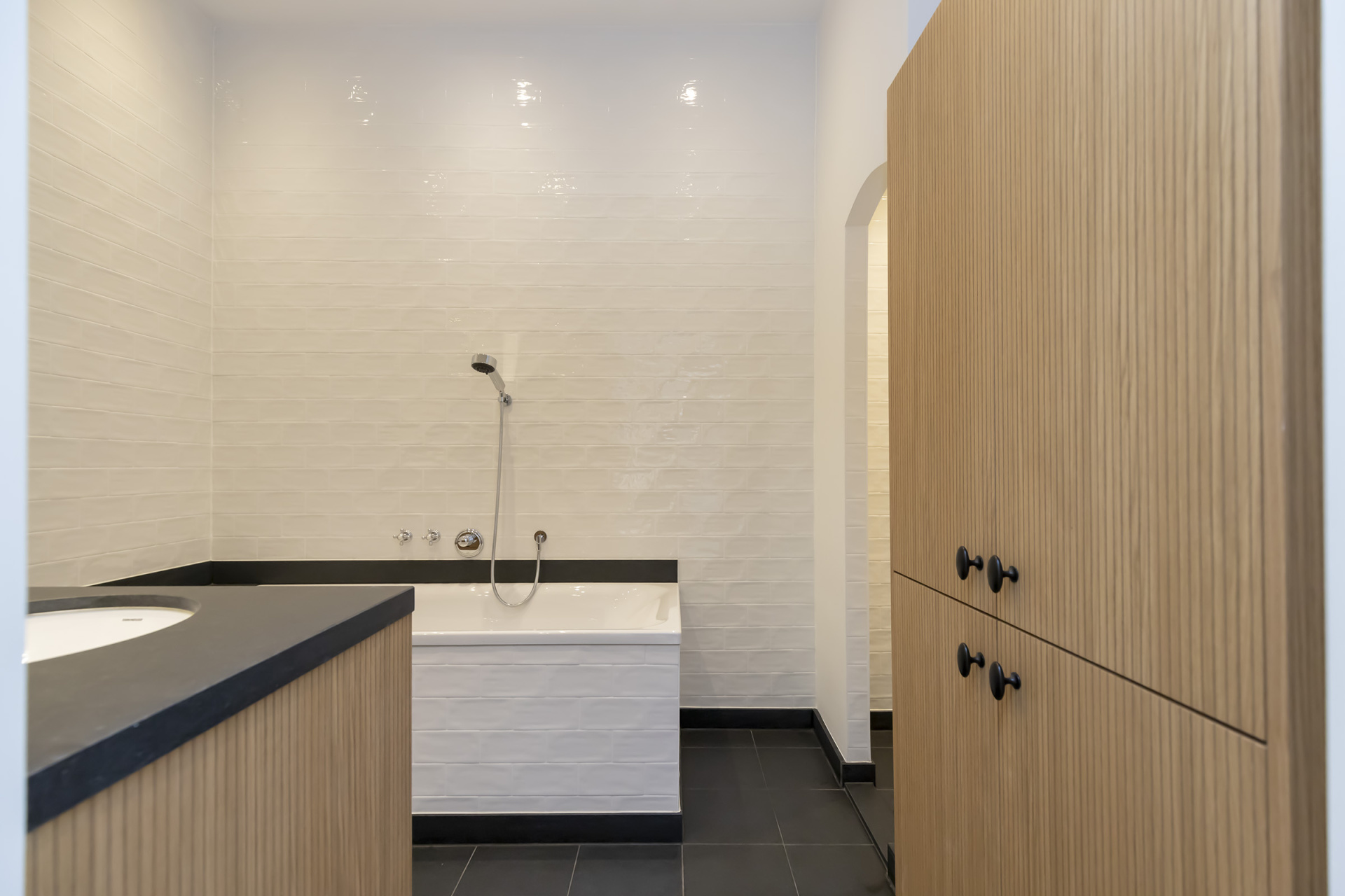 Badkamer: Luxe uitgevoerd met ligbad, inloop-regendouche, dubbele wastafel in natuursteen, Dornbracht kranen en kastruimte.