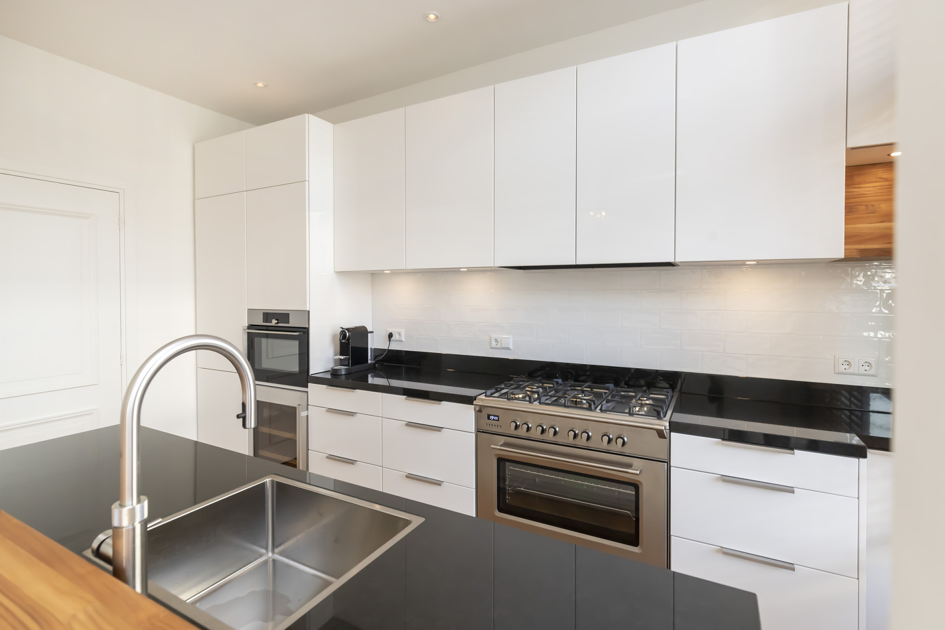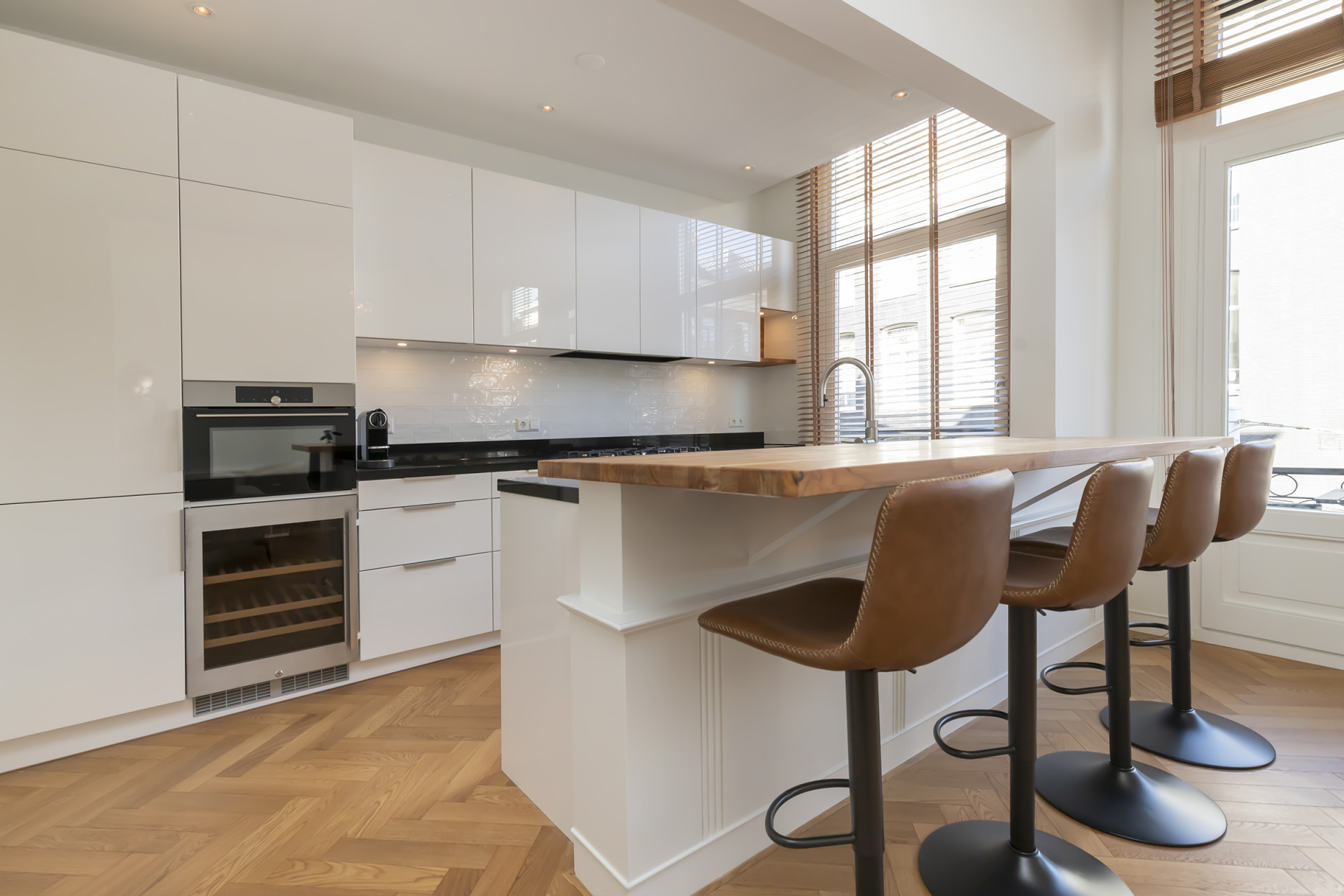 Keuken: Halfopen en zeer compleet uitgerust met o.a. een Boretti 5-pits gasfornuis, wijnklimaatkast, koelkast met ijsmachine, combi-oven/magnetron, afzuigkap, vaatwasser, Quooker 3-in-1 kraan en gezellige bar. Aangrenzend een praktische wasruimte.