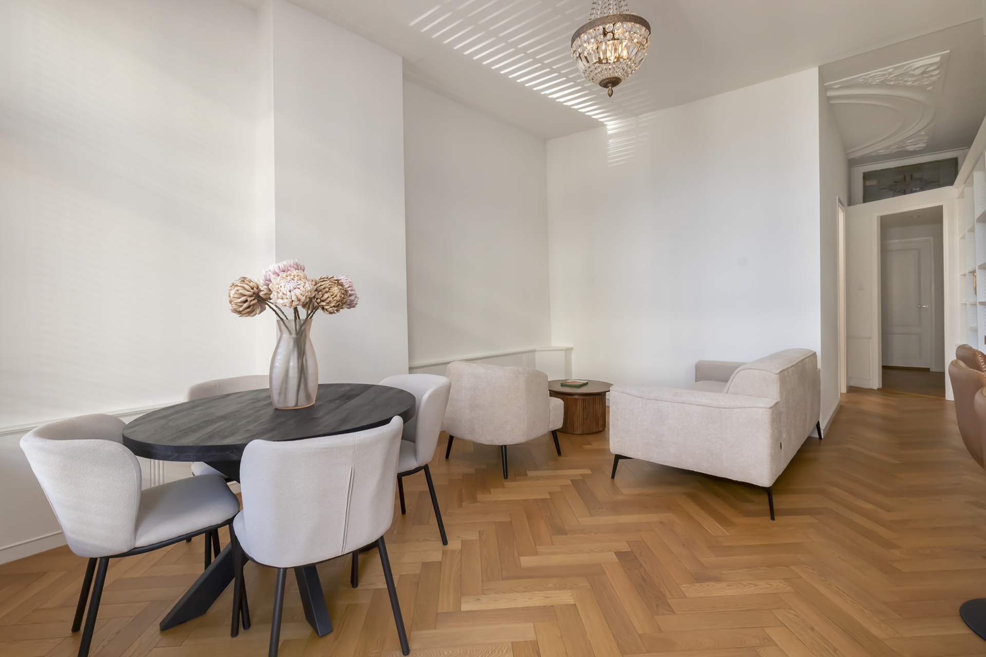 Woonkamer: Elegante lambrisering, op maat gemaakte kastenwand en dubbele openslaande deuren naar het balkon met fraai uitzicht.