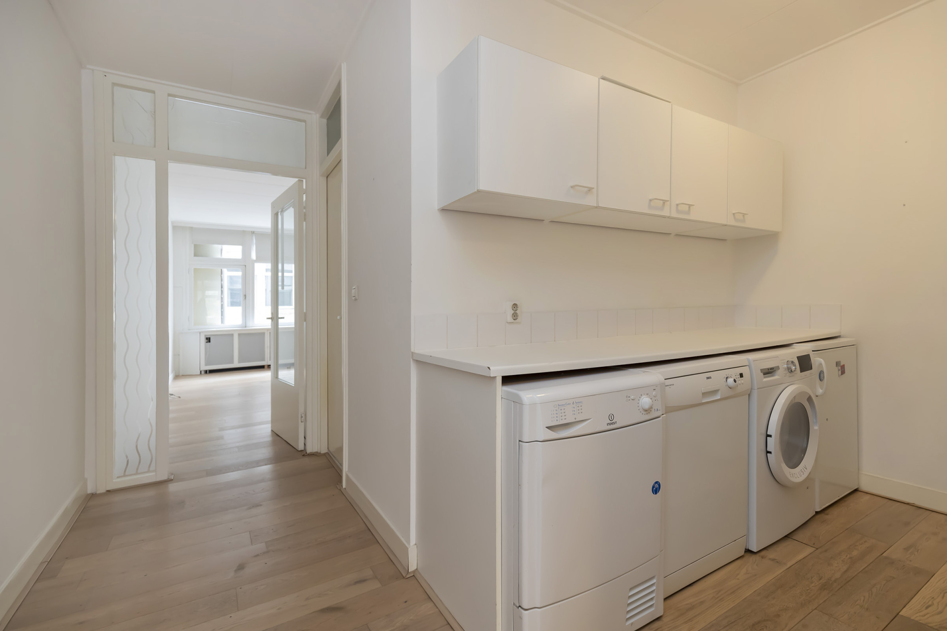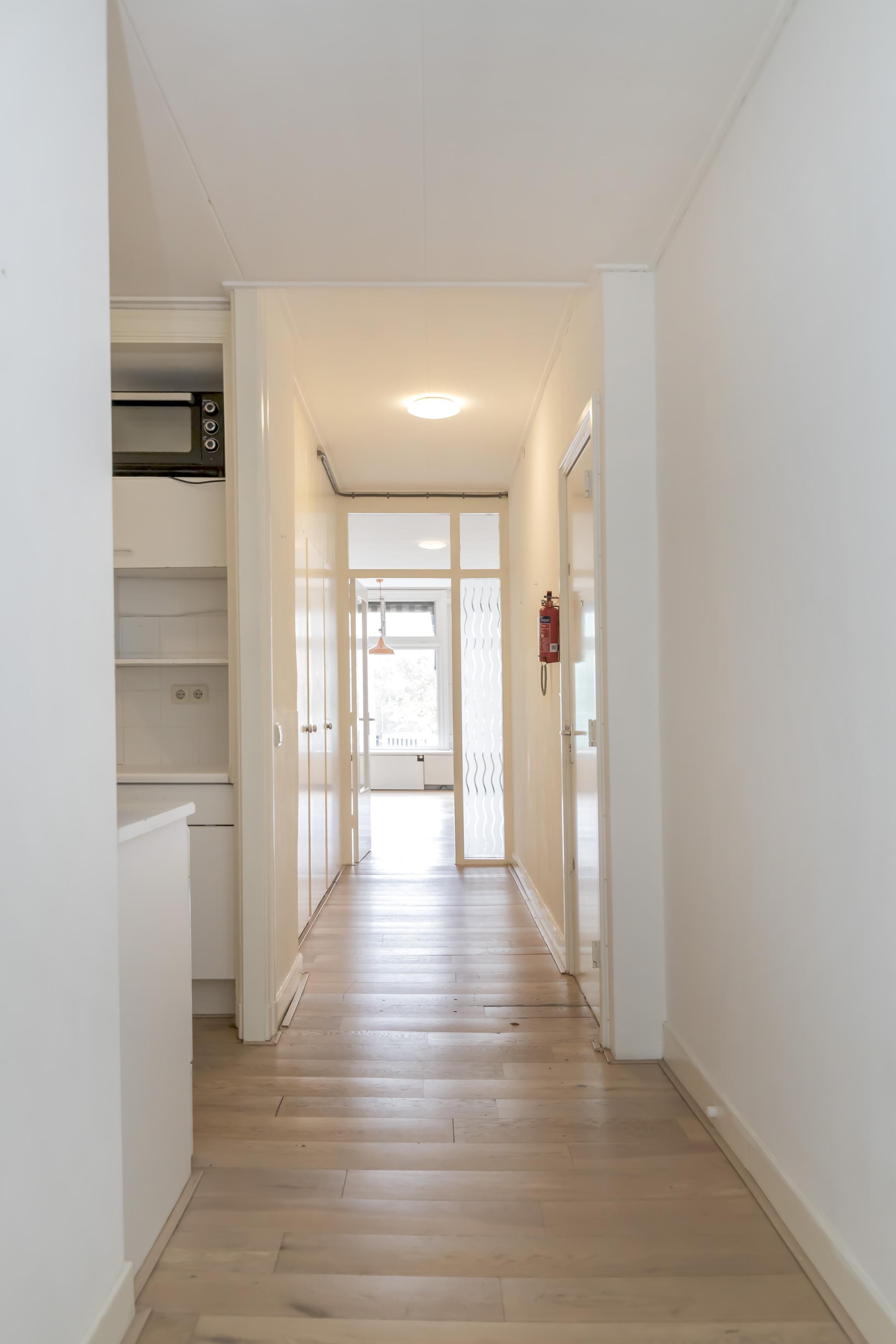 Binnen treft u aan de voorzijde een lichte woonkamer met uitzicht over het water. De ramen zorgen voor een prachtige lichtinval en geven het gevoel van ruimte en rust, midden in de stad.